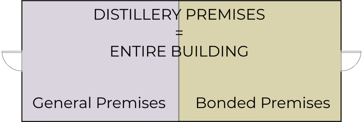 As you can see in these examples, you must have a clear understanding of the distinctions between a physical building and the logical distinctions within it for General and Bonded Premises, plus retail areas that are “Not part of premises”. In the simplest case, the physical Building, Distillery Premises and Bonded Premises are all referring to the same space. But if you have a more complicated physical layout, then the distinctions between those terms become very important.