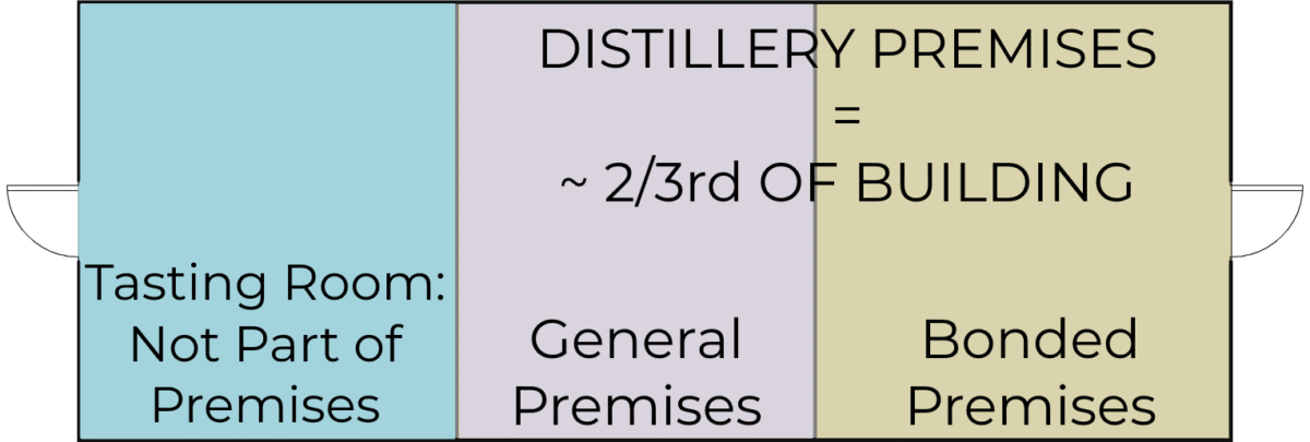 Note also that TTB will require an outside door for direct access to your Distillery Premises. If you are selling bottles, then your retail space (remember, not part of premises) should have its own dedicated exit (door) so that patrons are not bringing taxpaid alcohol into bonded premises when they walk out.
