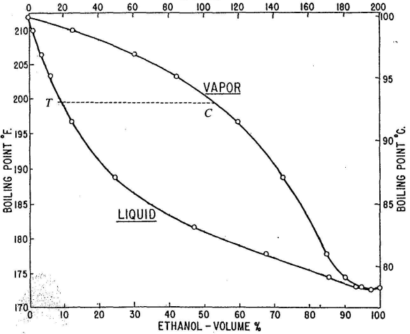 This mental picture of different components independently boiling at their respective boiling points is correct when you have liquids that do not mix. For example, if you put a 50/50 mix of olive oil and water into a still, the water component would boil at around 212F, leaving behind most of the olive oil, which would probably never hit it’s 570F boiling point. (Pedantic note: some of the oil would carry over with the water – this is how essential oil distillation works. It is a mechanical carry-over effect rather than vaporization of oil.)