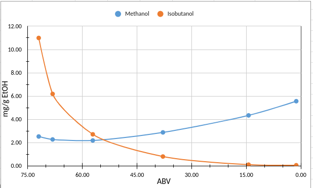 This means that methanol cannot be selectively removed by discarding early distillate fractions. We can go a step further and state that in a pot still, you’d actually be more effective at reducing methanol by discarding late fractions (tails).