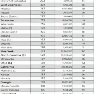 The top 10 states by population are listed in bold, while the lowest 10 states by population are listed in italic. Control states are marked with a (C). Permits per Capita is expressed in terms of permits per million population.