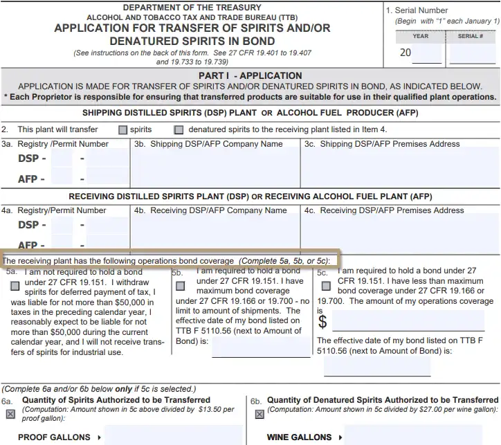 If you ever wondered why the TTB requires you to file a permit amendment & Application for Transfer of Spirits in Bond, you now understand one of the reasons. They must interrogate your bond coverage so that they can convey your “maximum allowed PGs in transit” to the sending DSP. Items 5a,b,c and 6a,b on the Application for Transfer of Spirits in Bond include this information: